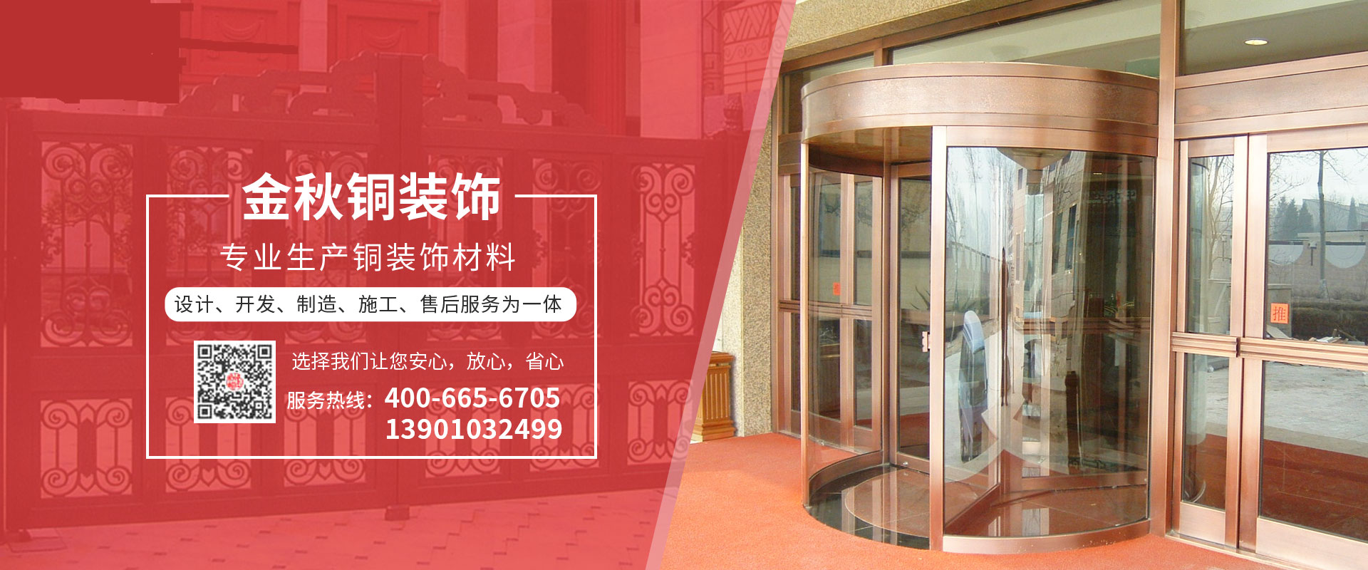 北京金秋銅裝飾材料有限公司是專業(yè)生產銅裝飾材料及設計、開發(fā)、制造、施工、售后服務為一體的大型綜合企業(yè)??沙薪咏ㄖ~裝飾工程及五星級酒店、別墅、博物館、樓樘管所等高檔銅裝飾項目;生產各種規(guī)格的旋轉門、平滑門、別墅門、電控門、工藝門、旋轉護欄、屋頂銅飾防水瓦、浮雕壁畫......